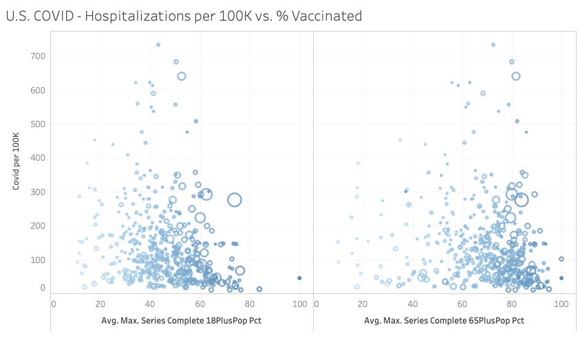 Of course, vaccines seem to have some good prowess especially for severe illnesses and hospitalizations. The finger-wagging started right away - “this is a pandemic of the unvaccinated” which wasn’t the case at all. There is no correlation that I can see for "low vax" counties and "high hospitalizations"