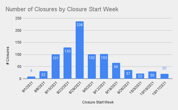Closure numbers this week were similar to the last few weeks (the up-to-date map can be found at the top of our School Opening Tracker page). This week we look at the percentage of schools affected by closures across individual states year to date and frame the types of quarantine modifications we are seeing.