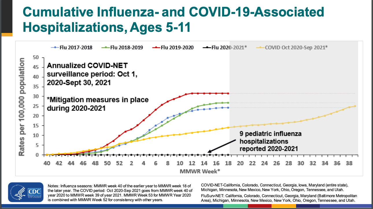 Next slide conveys the pace of COVID with that of previous periods of influenza. you can deduce very quickly that the hospitalization threat of the flu to our children is SIGNIFICANTLY greater than that of COVID-19.