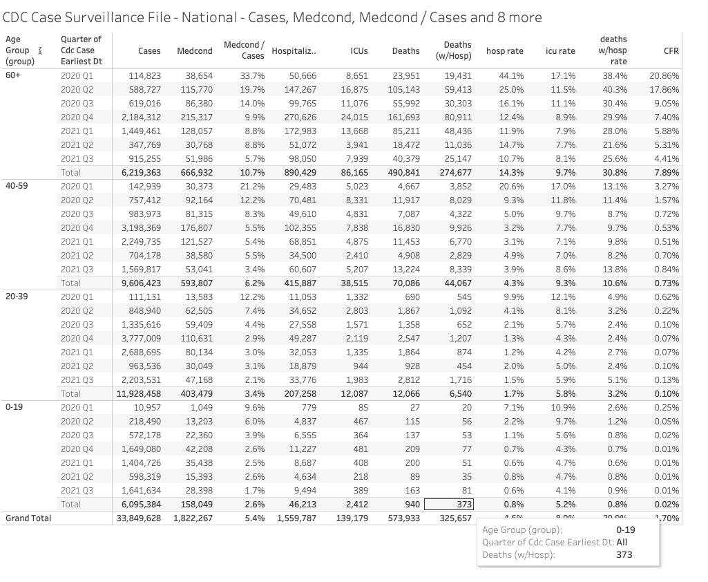 First, the CDC has updated their Case Surveillance File and noted that there are 373 deaths with hospitalizations between the ages of 0 and 19. There are over 83 million people in that age range. It also notes some 6 million confirmed cases and 46,000 hospitalizations.