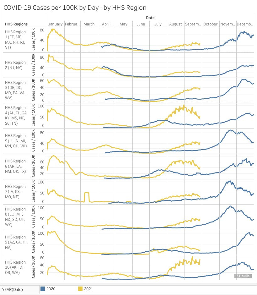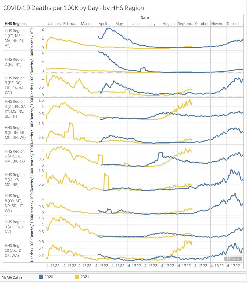 Comparing 2020 vs 2021 - I don't think it can be said that we're doing much better. In fact, it looks worse! Say what you will about vaxxed vs. unvaxxed we should not be seeing this type of difference year over year. NYT data. Grouped by HHS Region. Cases & Deaths / 100K.