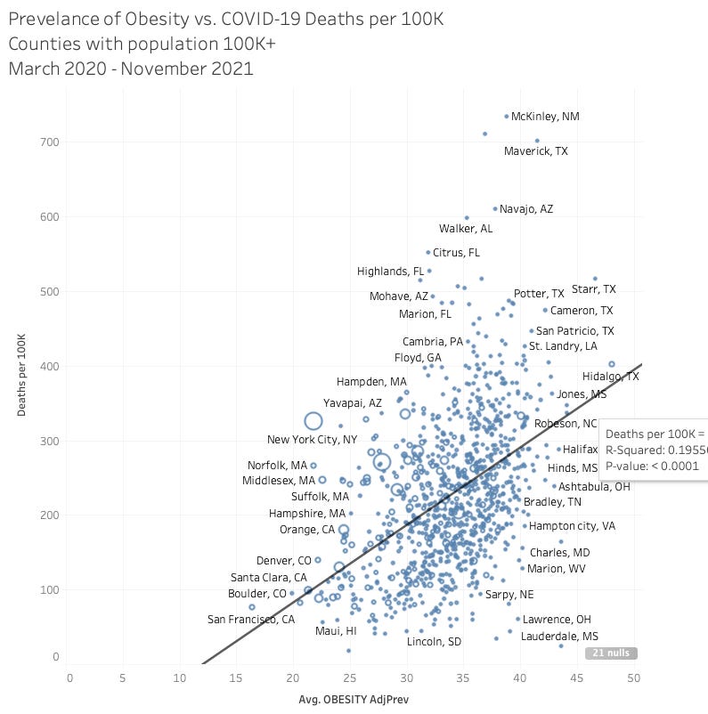 I’m told with the confounding measures and the massive amounts of data points that a .2 R-squared is fairly strong. In other words, there DOES INDEED seem to be some correlation between population adjusted COVID-19 deaths AND the prevalence of obesity in counties.